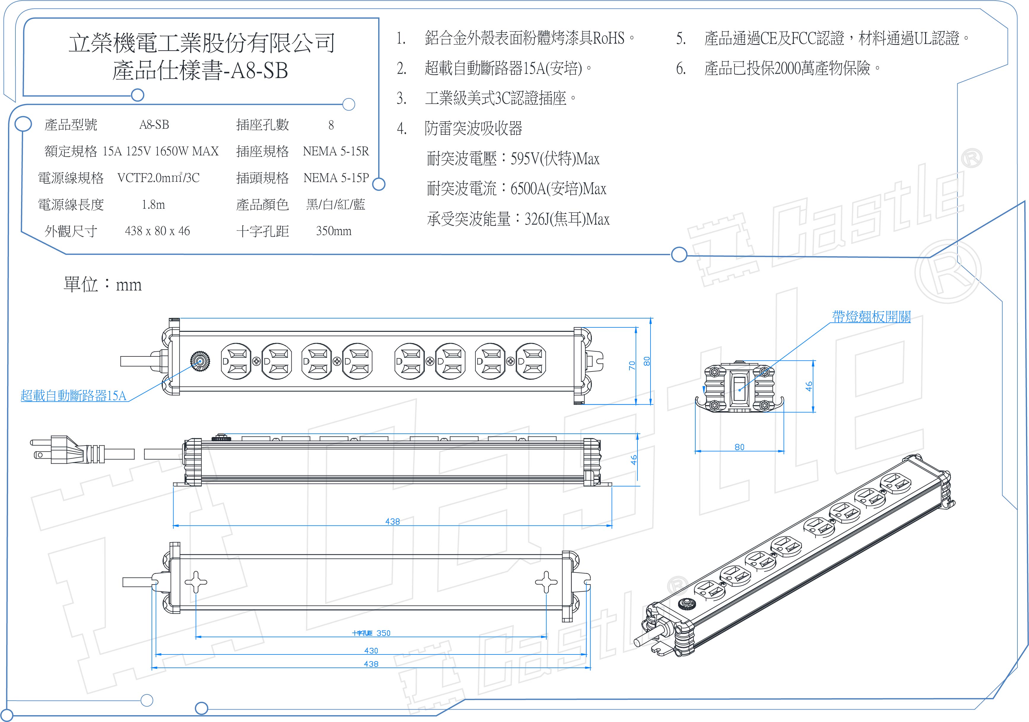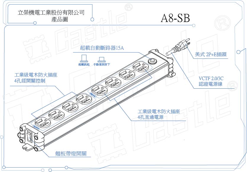 - 本產品最承載額定容量為110V、15A~1650W,勿使用125V以上電壓,若超過負荷用電時,自動斷器而切斷電源時,帶排除超載現象後可將按鈕壓下,即可恢復正常供電。